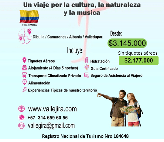Nuestra aventura comienza en Dibulla, lugar tranquilo, gastronomía y tertulias nocturnas a la orilla del mar “el sitio ideal para volver a nacer”, apuesto que saben que fue el lugar donde nació Carlos Huertas, compositor del «Cantor de Fonseca». Continuamos con el hogar de los flamencos rosados, sí. Camarones, la tierra del negro robles, ahí tiene su casa museo, pero todo no acaba aquí, el siguiente destino es Albania, taller de tejido, experiencia en ranchería, y por ultimo y no menos importante, la capital mundial del vallenato, una cátedra inmersiva de Vallenato donde usted va a ser el artista, el que baila, el que canta, el que compone, el que graba.