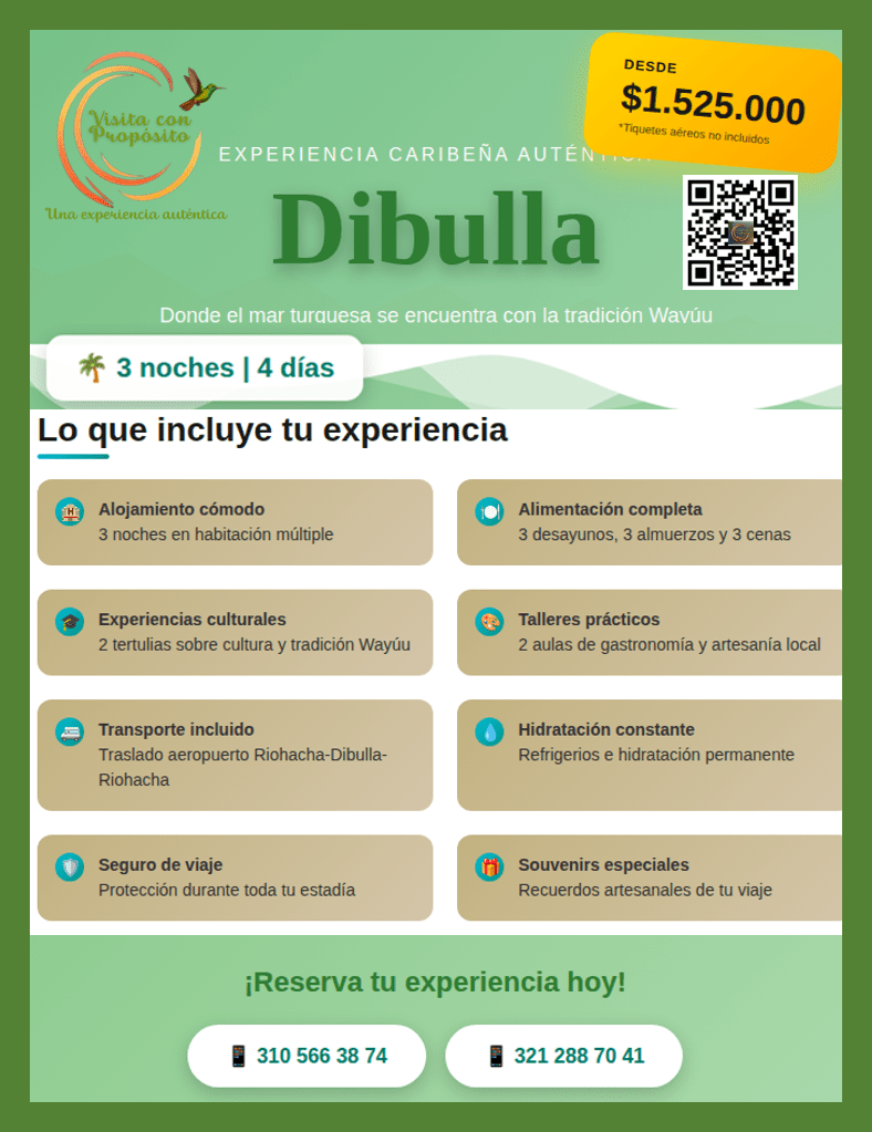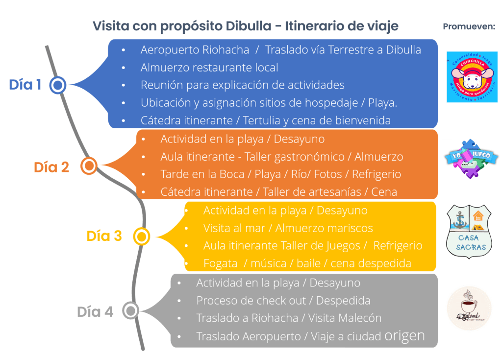 El plan de viaje tiene una duración de cuatro (4) días y durante su estancia en el municipio de Dibulla, los viajeros disfrutarán de la majestuosidad del mar caribe y la tranquilidad de sus playas; vivirán experiencias en este magnífico territorio que potenciarán un aprendizaje significativo desde la corporeidad, el juego, la gastronomía y el movimiento.