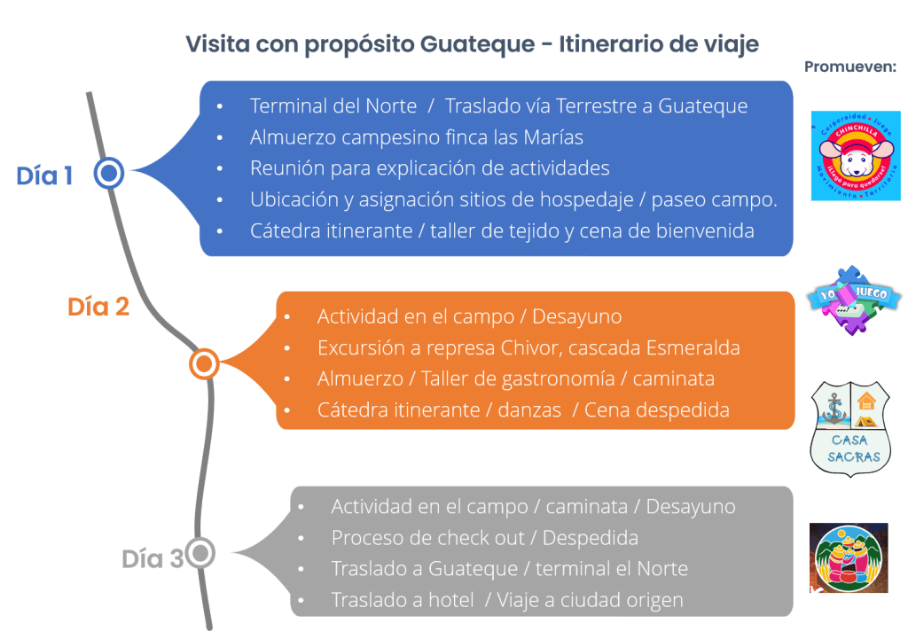 El plan de viaje está sustentado y diseñado con un enfoque de turismo sostenible y cultural. El conocimiento de la diversidad de costumbres, además del paisaje natural que brinda el territorio, son de gran relevancia y para ello, se cuenta con guías locales del territorio mismo y con personas mayores residentes de Guateque a quienes hemos llamado el grupo anfitrión.